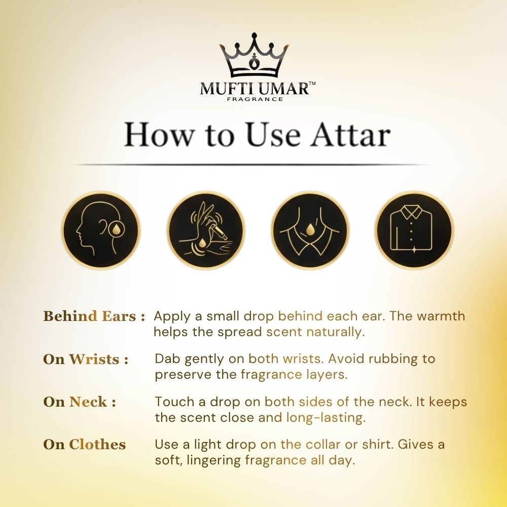 This non-alcoholic attar opens with delicate notes of Rose and Jasmine, evoking freshness and floral elegance. The heart reveals the warm allure of White Musk, while the base settles into the rich, comforting essence of Amber and Musk, creating a long-lasting fragrance that lingers beautifully throughout the day.